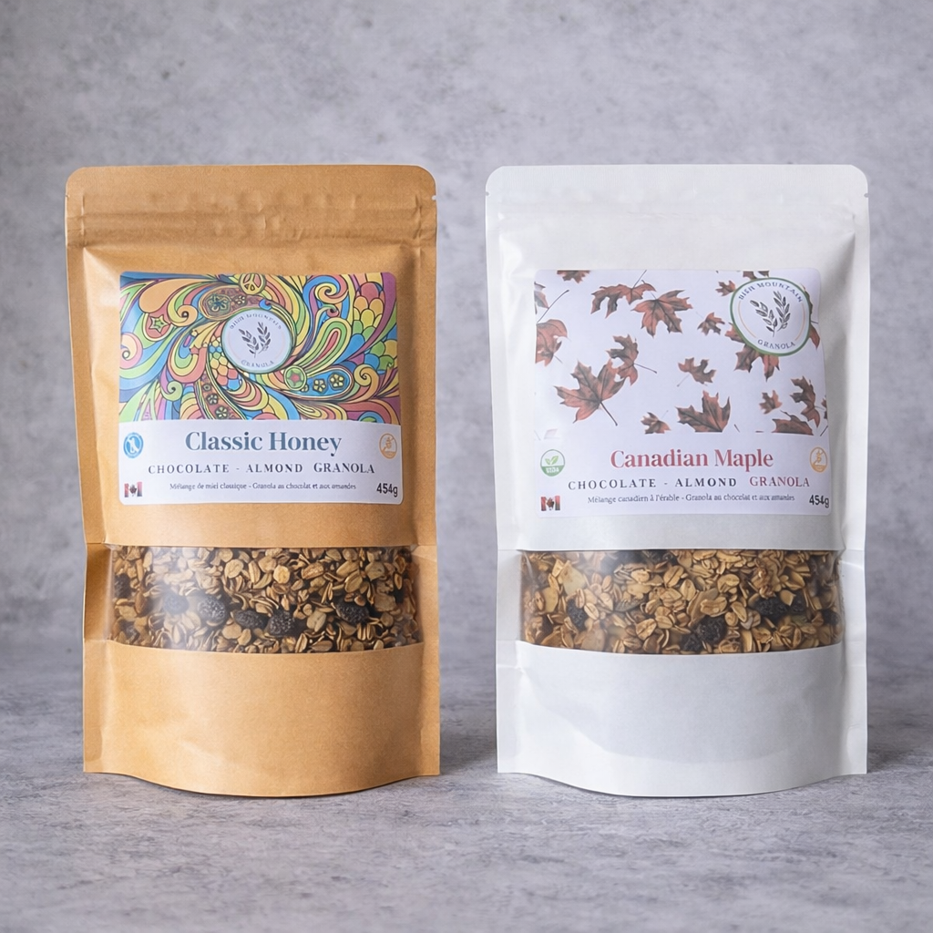 Our Classic Maple & Honey granolas bring together two simple, time-honored blends that stick to the basics. Sweetened with real Canadian honey and maple syrup, these granolas focus on familiar flavors and carefully chosen ingredients - lightly accented with chocolate and warm notes of vanilla and spice.